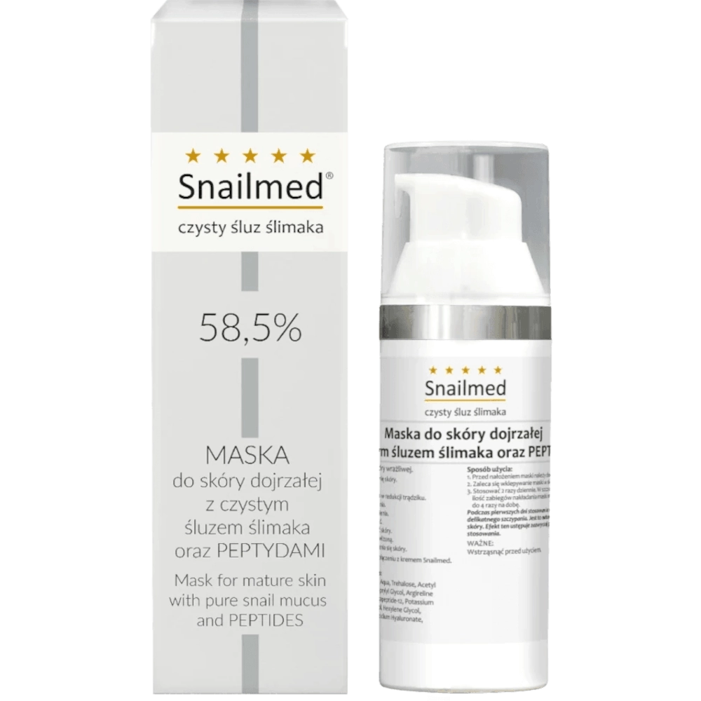 Niezwykle skuteczna maska odżywczo regenerująca, przywracająca prawidłowe funkcjonowanie skóry, niezbędne w profilaktyce kosmetycznej. Mający szybkie działanie, najwyższej jakości preparat dermokosmetyczny, którego ponad połowa objętości (58,5% całej formuły) to skoncentrowany, naturalny, czysty śluz ślimaka. Formuła preparatu zawiera w składzie dodatkowo Peptydy biomimetyczne kierujące procesami metabolicznymi konkretnych komórek docelowych. Optymalna formulacja i stężenie naturalnego, czystego śluzu ślimaka w połączeniu z najwyższej jakości komponentami aktywnymi, stanowi o najwyższej skuteczności maski. Preparat bardzo wydajny w zastosowaniu, o wyraźnie ukierunkowanym a przy tym wielorakim, kompleksowym działaniu, dobroczynnym dla skóry – dzięki optymalnemu stężeniu, naturalnego czystego śluzu ślimaka w wysokości 58,5%. Bestseller firmy Snailmed.