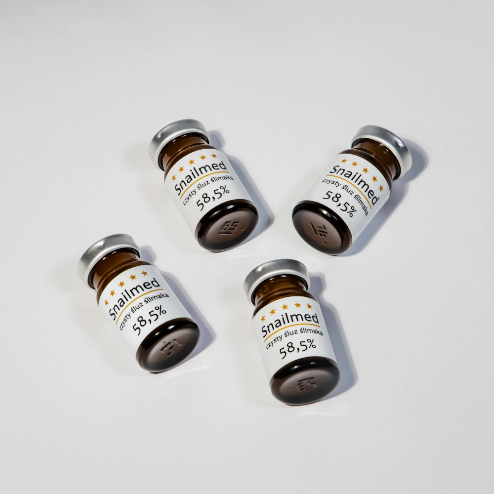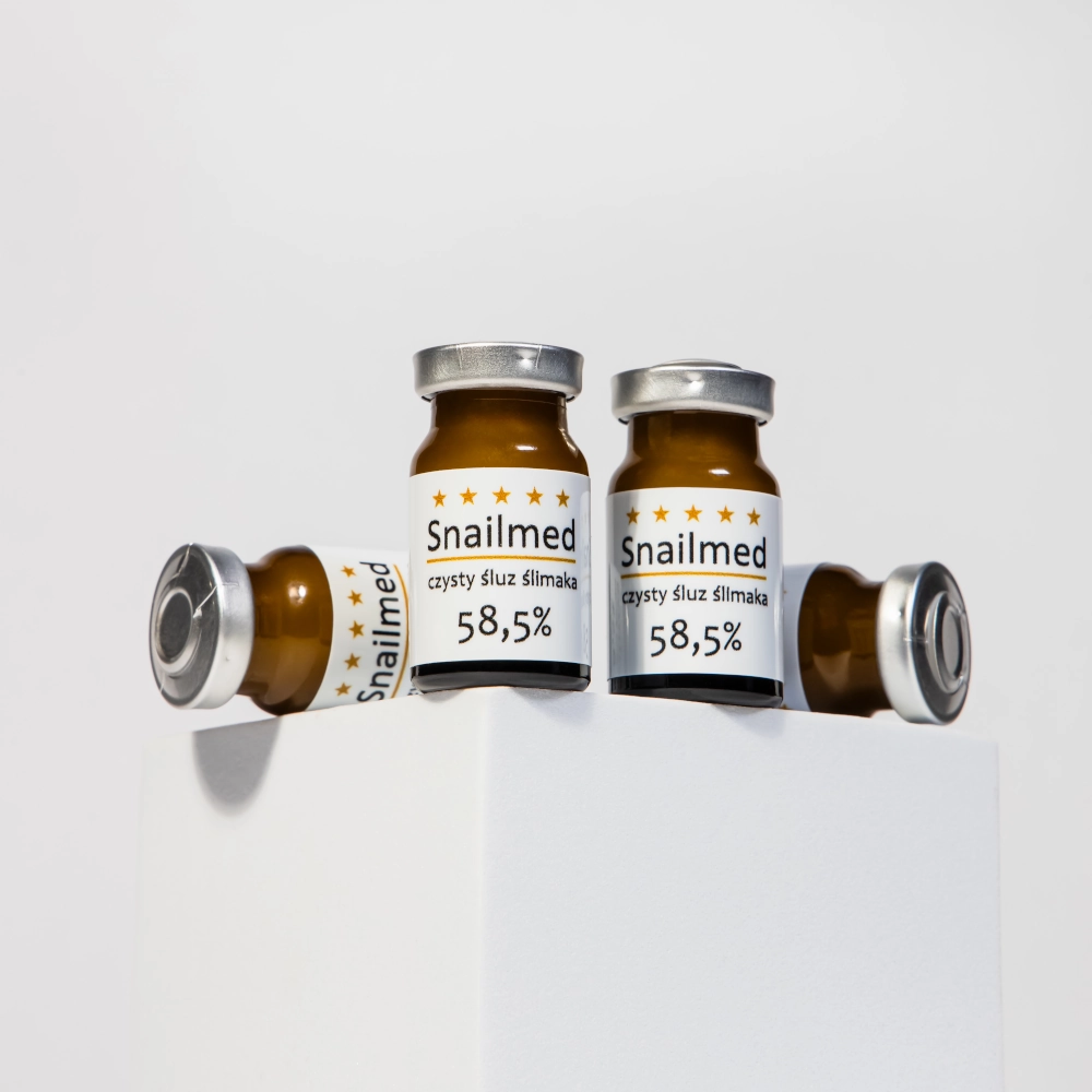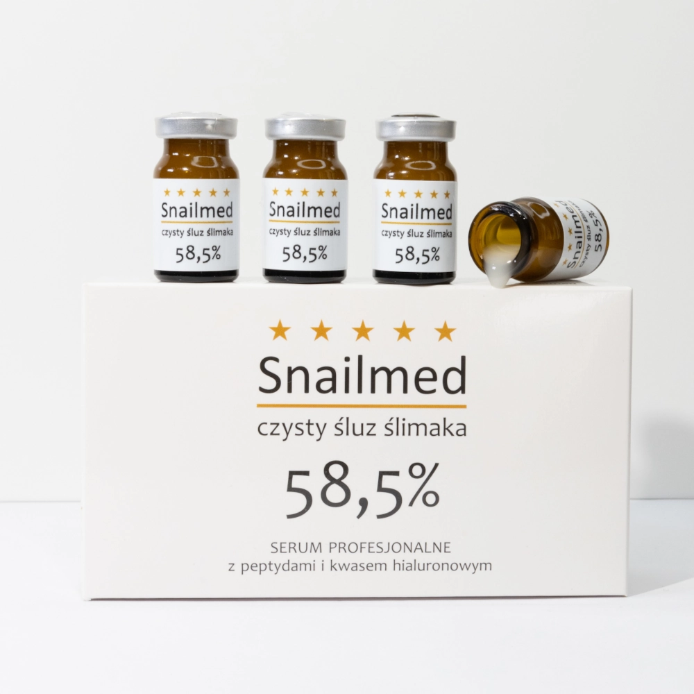 Profesjonalne serum odżywcze, przywracające prawidłowe funkcjonowanie skóry, niezbędne w profilaktyce i terapii kosmetycznej. Przeznaczone do stosowania w warunkach domowych jak i aplikacji w gabinetach kosmetycznych, głęboko penetrujące serum, dostarczające cenne składniki do wszystkich warstw naskórka i skóry właściwej. Mający szybkie działanie, najwyższej jakości preparat dermokosmetyczny, którego ponad połowa objętości (58,5% całej formuły) to skoncentrowany, naturalny, czysty śluz ślimaka. Formuła preparatu zawiera w składzie dodatkowo Peptydy biomimetyczne kierujące procesami metabolicznymi konkretnych komórek docelowych. Optymalna formulacja i stężenie naturalnego, czystego śluzu ślimaka w połączeniu z najwyższej jakości komponentami aktywnymi, stanowi o najwyższej skuteczności serum. Preparat bardzo wydajny w użyciu – opakowanie (4 ampułki x 8ml) pozwala na pełną kurację. Serum, o wyraźnie ukierunkowanym a przy tym wielorakim, kompleksowym działaniu, dobroczynnym dla skóry – dzięki optymalnemu stężeniu, naturalnego czystego śluzu ślimaka w wysokości 58,5%. Bestseller firmy Snailmed.