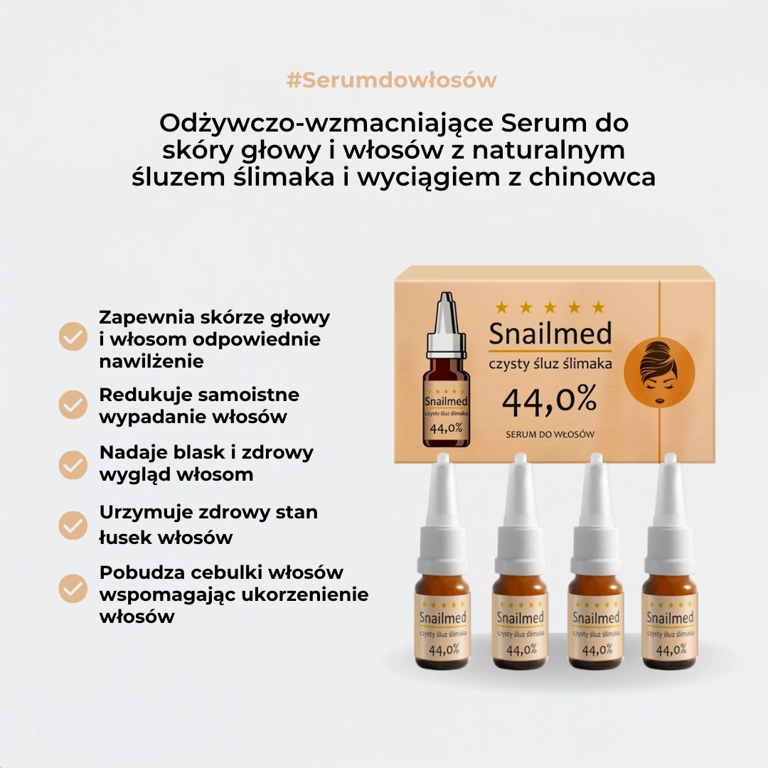 Niezwykle skuteczne serum do włosów i skóry głowy, niezbędne w każdej apteczce i kosmetyczce. Najwyższej jakości preparat dermo-kosmetyczny, którego prawie połowa objętości (44,0% całej formuły) to skoncentrowany, czysty śluz ślimaka. Serum niezwykle wydajne w użyciu i skuteczne w działaniu, o wielokierunkowym i kompleksowym oddziaływaniu regeneracyjnym, odżywczym i wzmacniającym oraz dobroczynnym dla włosów i skóry głowy. Dodatek witamin oraz wyciągu z chinowca wzmacnia, przyciemnia i zagęszcza włosy. Jest w 100% naturalne, nie podrażnia.