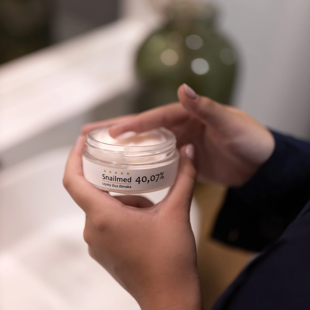 Regularnie stosowany „Przeciwstarzeniowy, codzienny krem do twarzy Biała Perła z Totarolem oraz kwasem hialuronowym, na bazie naturalnego, czystego śluzu ślimaka w wysokim stężeniu 40,07%” marki Snailmed: