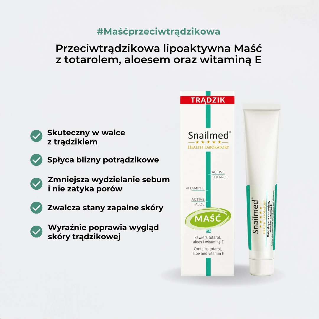 Niezwykle skuteczna, przeciwtrądzikowa maść lipoaktywna, przydatna w każdej kosmetyczce. Produkt dermokosmetyczny najwyższej jakości, przywracający prawidłowe funkcjonowanie skóry trądzikowej, osób w każdym wieku. Formuła preparatu zawiera w składzie doskonałej jakości komponenty aktywne: drogocenny Totarol oraz medycznej jakości aloes i witaminy. Optymalna formulacja stanowi o najwyższej skuteczności maści. Preparat wydajny w użyciu. Maść, o wyraźnie ukierunkowanym a przy tym wielorakim, kompleksowym działaniu normalizującym oraz regeneracyjnym, dobroczynnym dla skóry. Nie zawiera substancji zapachowych