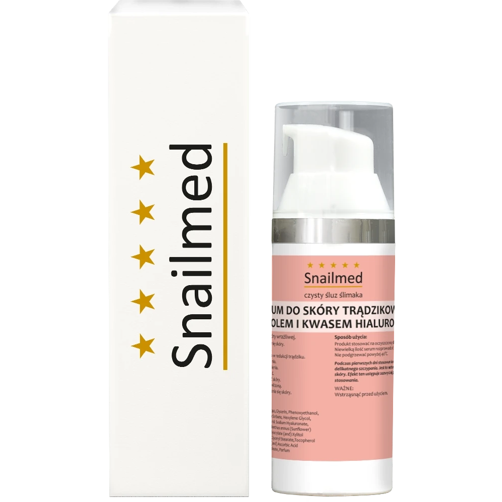Niezwykle skuteczne serum do zadań specjalnych, niezbędne w każdej apteczce i kosmetyczce. Przeznaczone do samodzielnej aplikacji w domu, przywracające prawidłowe funkcjonowanie skóry trądzikowej w każdym wieku. Głęboko penetrujące, dostarczające cenne składniki do wszystkich warstw naskórka i skóry właściwej. Mające szybkie działanie, najwyższej jakości preparat dermokosmetyczny, którego ponad połowa objętości (58,5% całej formuły) to skoncentrowany, naturalny, czysty śluz ślimaka. Formuła preparatu zawiera w składzie dodatkowo: drogocenny Totarol oraz kwas hialuronowy najwyższej jakości. Optymalna formulacja i stężenie, naturalnego, czystego śluzu ślimaka w połączeniu z najwyższej jakości komponentami aktywnymi, stanowi o najwyższej skuteczności serum. Preparat bardzo wydajny w użyciu. Serum, o wyraźnie ukierunkowanym a przy tym wielorakim, kompleksowym działaniu, dobroczynnym dla skóry – dzięki optymalnemu stężeniu, naturalnego czystego śluzu ślimaka w wysokości 58,5%. Bestseller firmy Snailmed.