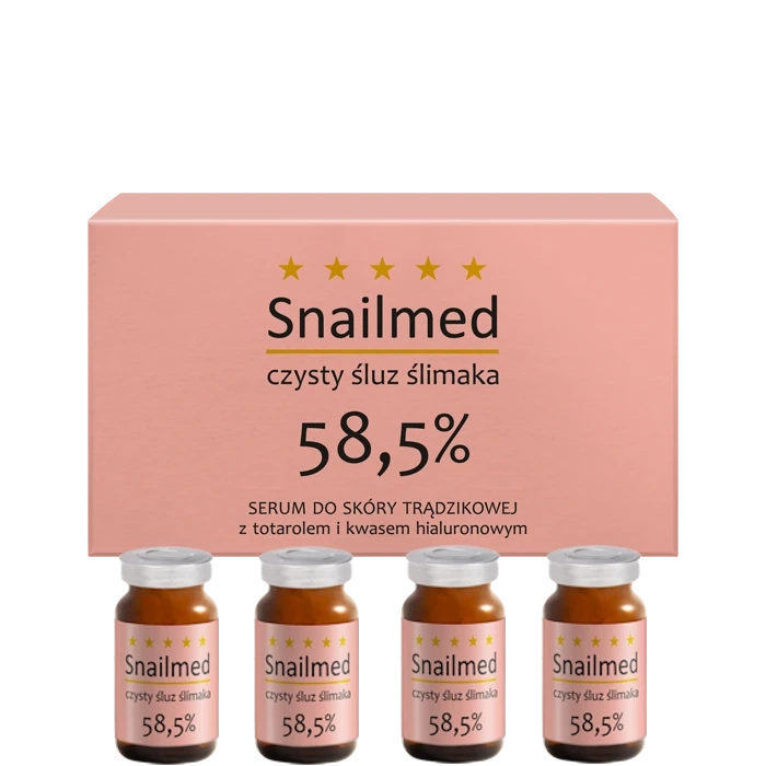 Profesjonalne serum do zadań specjalnych, przywracające prawidłowe funkcjonowanie skóry trądzikowej w każdym wieku; niezbędne w profilaktyce i terapii kosmetycznej. Przeznaczone do stosowania w warunkach domowych jak i aplikacji w gabinetach kosmetycznych, głęboko penetrujące serum, dostarczające cenne składniki do wszystkich warstw naskórka i skóry właściwej. Mający szybkie działanie, najwyższej jakości preparat dermokosmetyczny, którego ponad połowa objętości (58,5% całej formuły) to skoncentrowany, naturalny, czysty śluz ślimaka. Formuła preparatu zawiera w składzie dodatkowo: drogocenny Totarol oraz kwas hialuronowy najwyższej jakości. Optymalna formulacja i stężenie, naturalnego, czystego śluzu ślimaka w połączeniu z najwyższej jakości komponentami aktywnymi, stanowi o najwyższej skuteczności serum. Preparat bardzo wydajny w użyciu – opakowanie (4 ampułki x 8 ml) pozwala na pełną kurację. Serum, o wyraźnie ukierunkowanym a przy tym wielorakim, kompleksowym działaniu, dobroczynnym dla skóry – dzięki optymalnemu stężeniu, naturalnego czystego śluzu ślimaka w wysokości 58,5%. Bestseller firmy Snailmed.